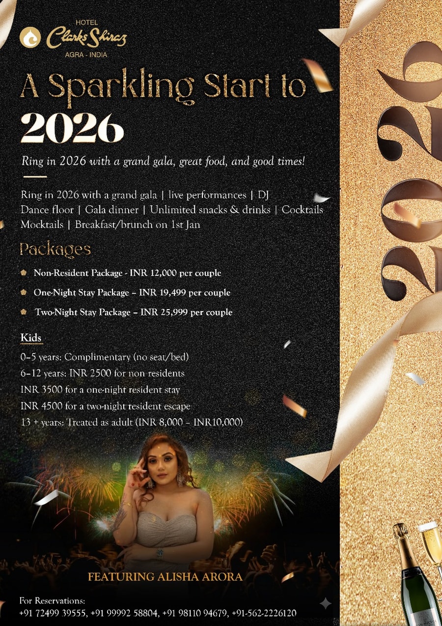 Gala Dinner on New Year’s Eve, 31st December 2025, at Shehnaz Hall & Lawn, featuring free-flowing drinks and mouth-watering snacks. Enjoy a live musical performance by the sensational singer Alisha Arora with her band, followed by a DJ and dance floor to celebrate the night away.